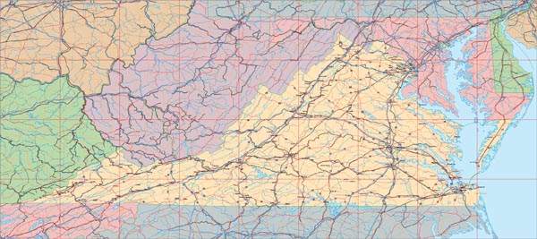 ![]() Detail view of EPS Vector Map of Virginia - the land fill color is switched on. The EPS Vector map for Virginia has 28 layers which may be individually modified or removed. Select the Vector only EPS map of Virginia option to download this style map. |