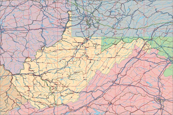 ![]() Detail view of EPS Vector Map of West Virginia - the land fill color is switched on. The EPS Vector map for West Virginia has 26 layers which may be individually modified or removed. Select the Vector only EPS map of West Virginia option to download this style map. |